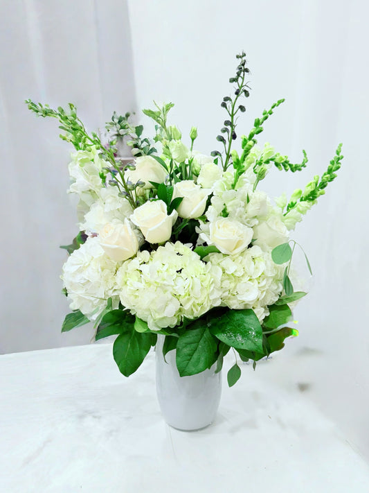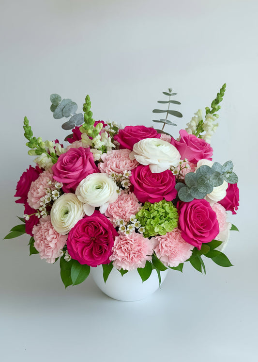 The vase arrangement is a beautiful display of flowers, with roses, daisies, and baby’s breath nestled together. The colors blend harmoniously, with pops of pink, yellow, and white brightening the room. The fragrance fills the air, evoking a sense of freshness and beauty.